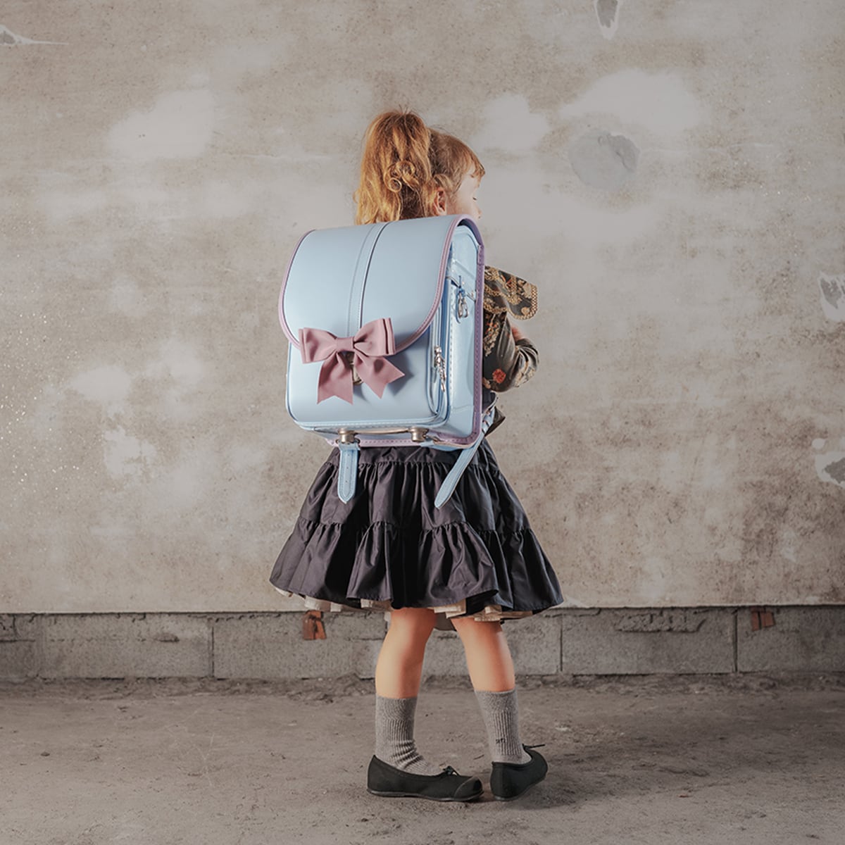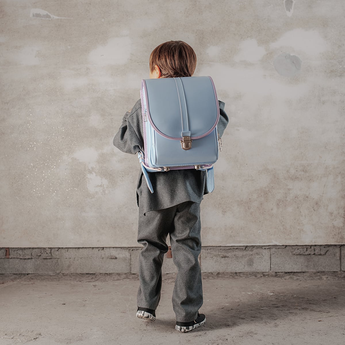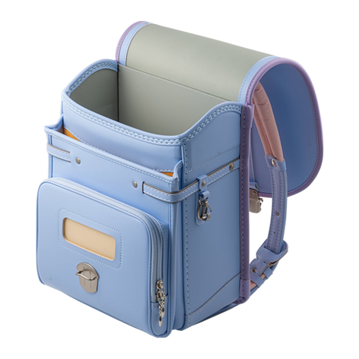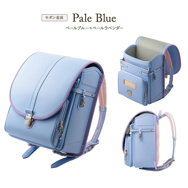 ランドセル本体は、はかなげなペールブルーカラーに加え、ヘリ巻き部分には淡いペールラベンダーカラーを採用。