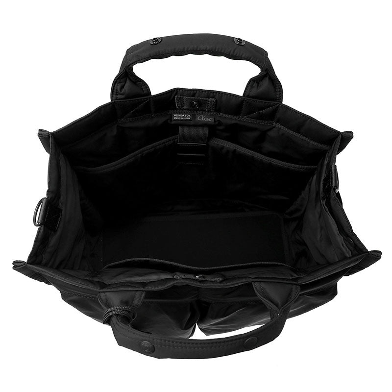 13inch のPCや雑誌などが入るサイズのトートバッグ(L)です。マチ幅を広く設けてフォルムを美しく保つように仕上げています。メイン収納部の口元はホックで開閉する仕様で、荷物の出し入れを簡単に行うことができます。内装にPCスリーブを付属しているため、オン・オフどちらのシーンでもお使いいただけます。「αGEL」を内蔵したハンドルは握りやすく、重さを感じにくいのが特徴です。
