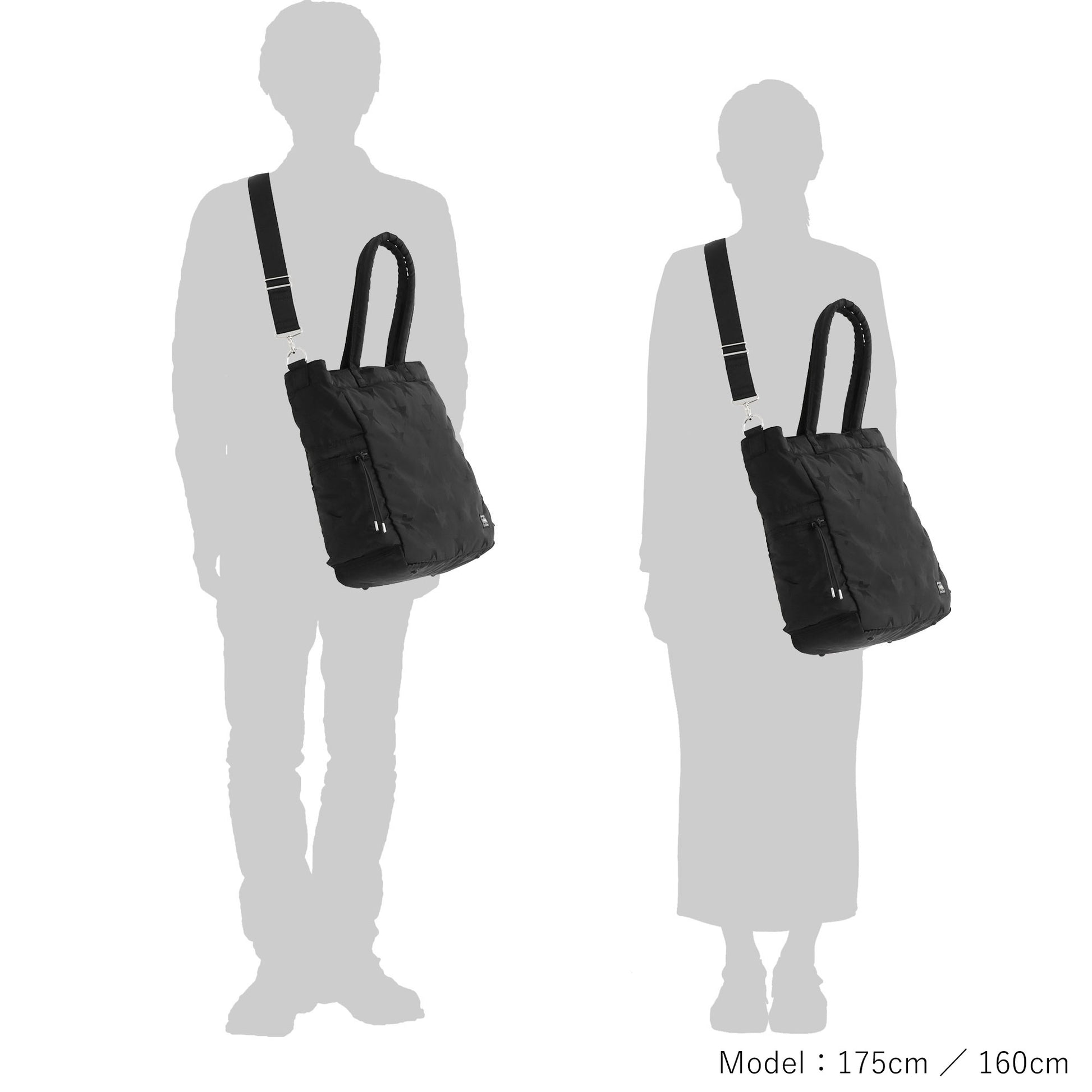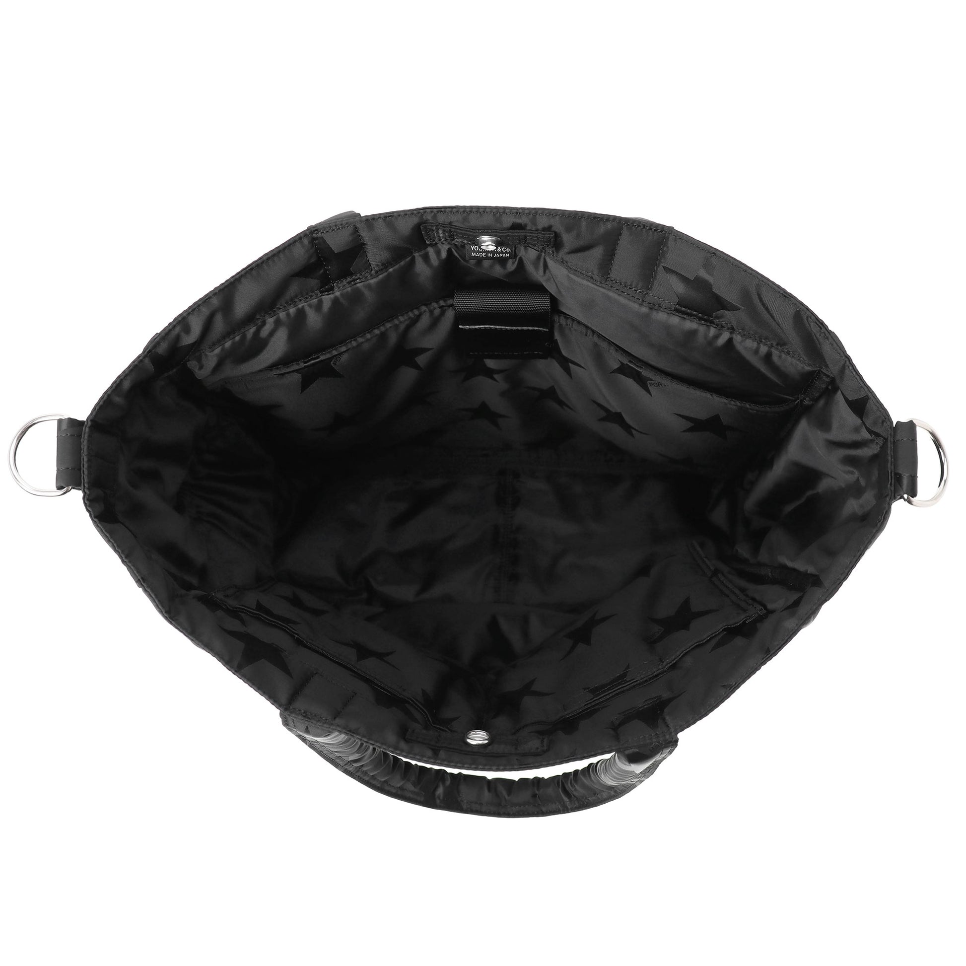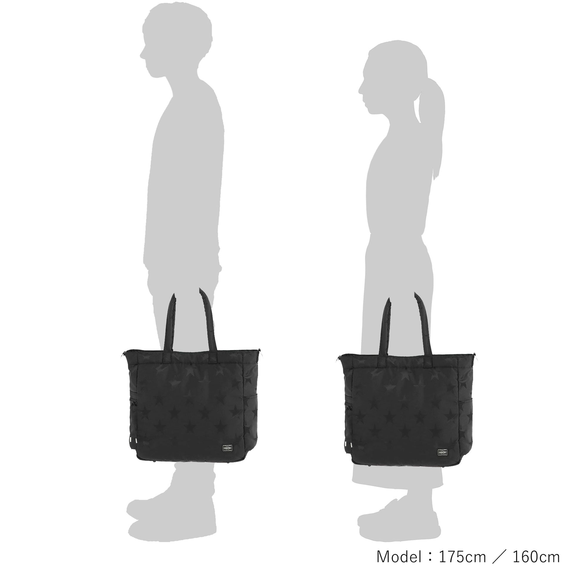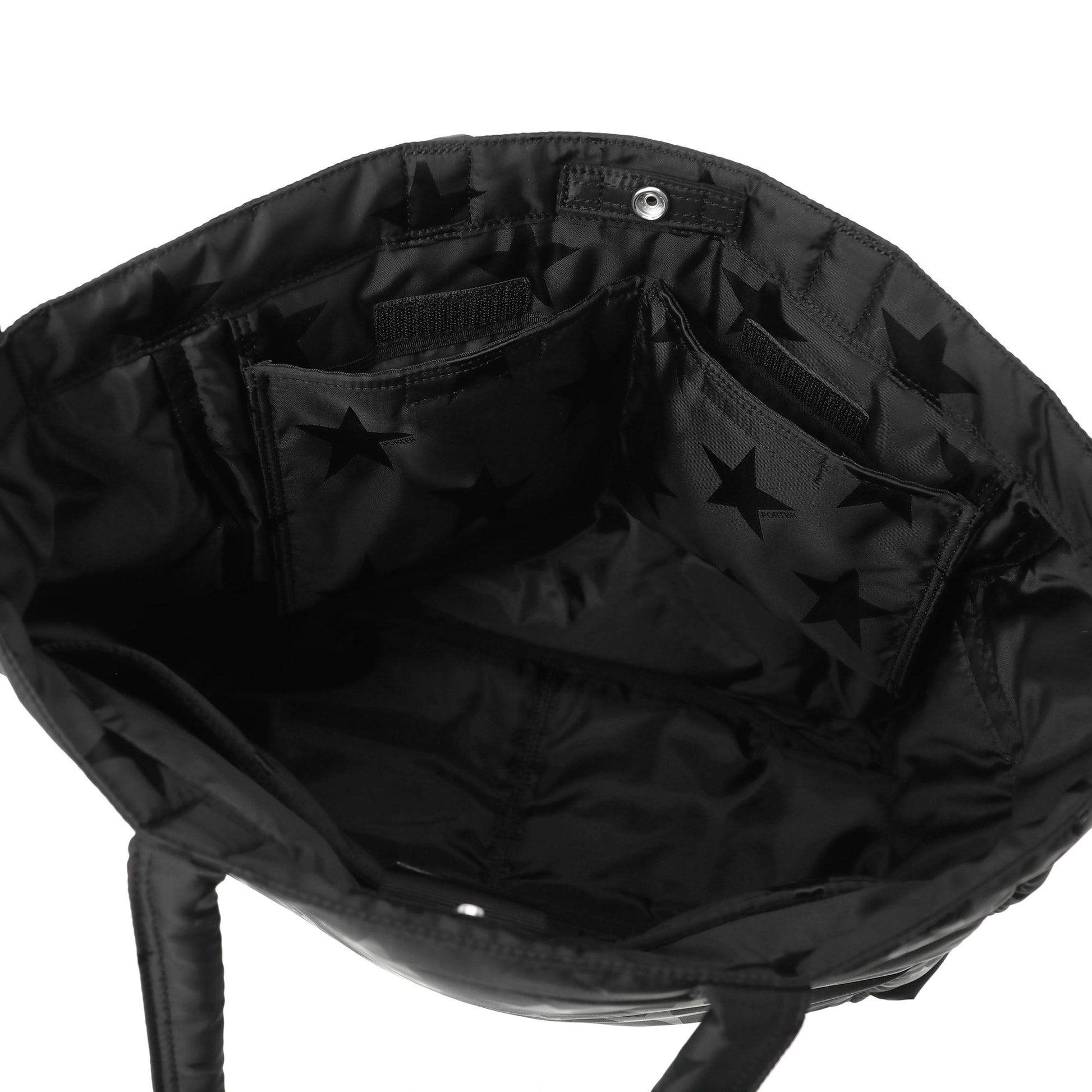 光の角度によって立体的な表情が浮かび上がる星柄とPORTER ロゴを組み合わせたオリジナルの生地は、ブラックワントーンで上品な印象に仕上げています。