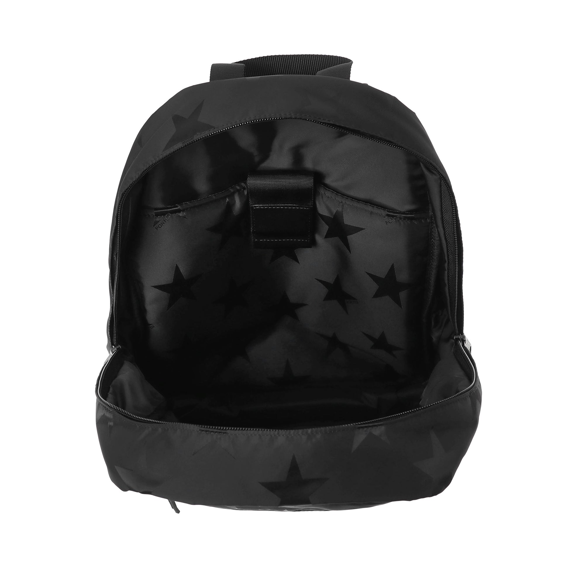 光の角度によって立体的な表情が浮かび上がる星柄とPORTER ロゴを組み合わせたオリジナルの生地は、ブラックワントーンで上品な印象に仕上げています。