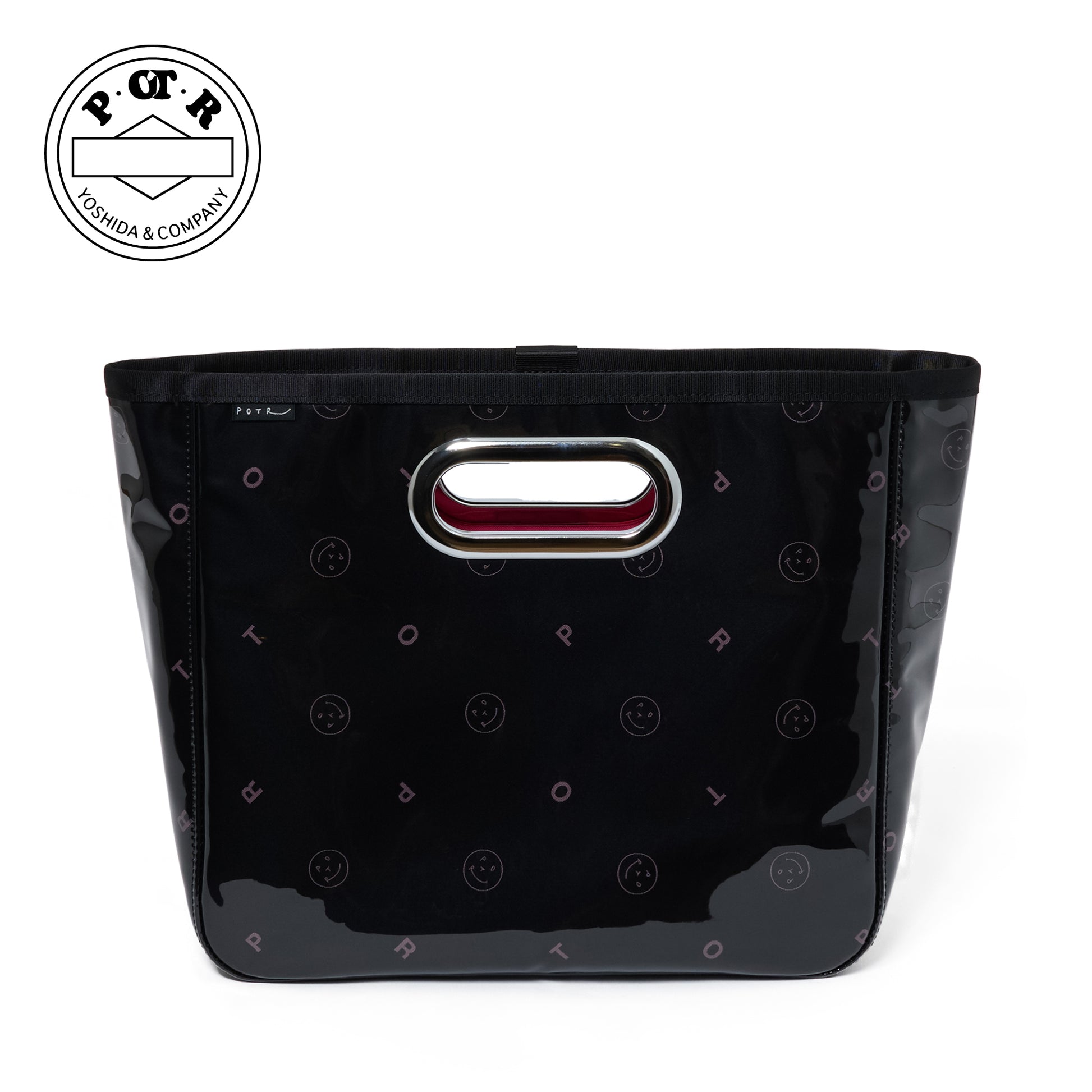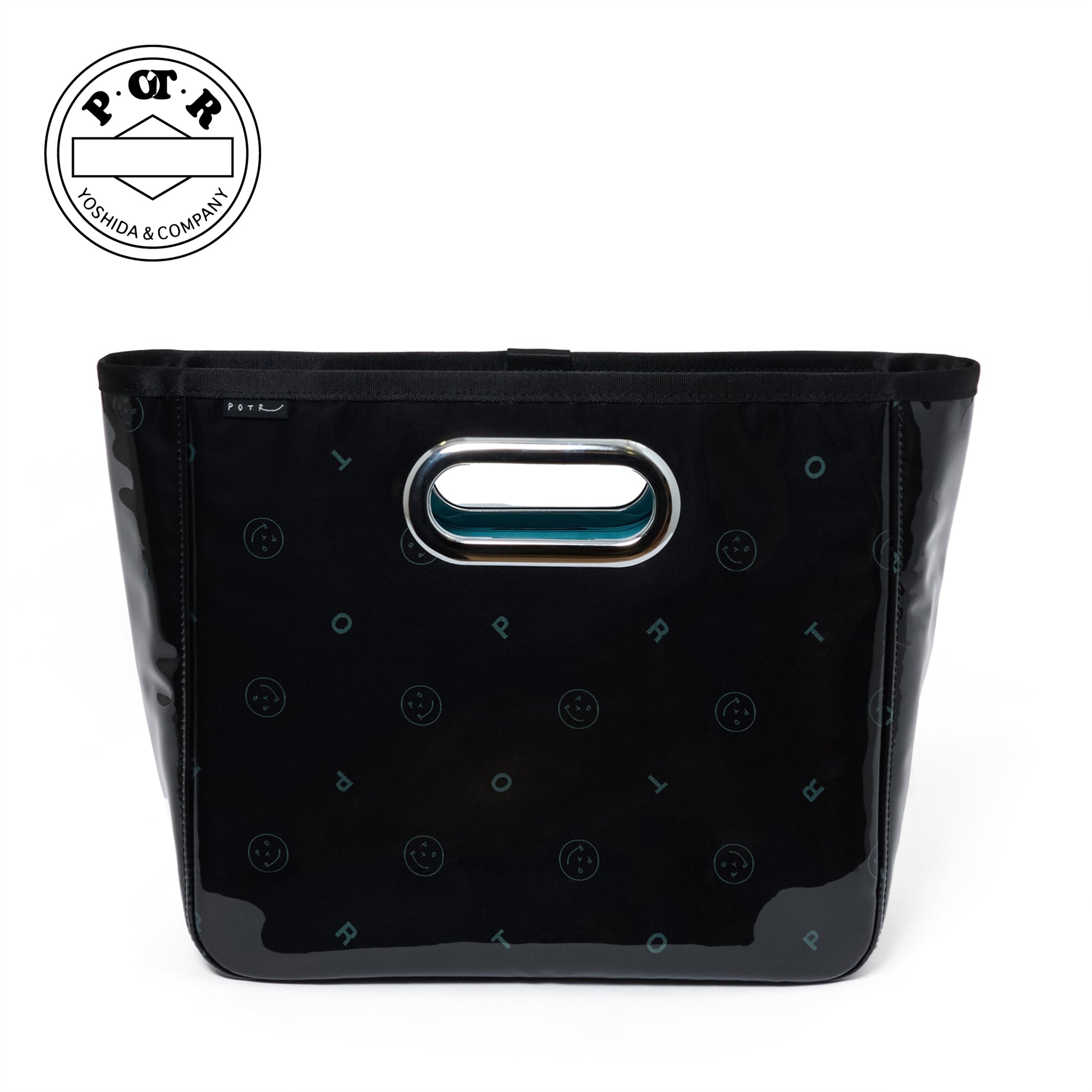美しく繊細なジャカード織りの生地に、グロッシーなPVC素材を纏わせたバッグ本体は、光を受けてつやを放ちます。
